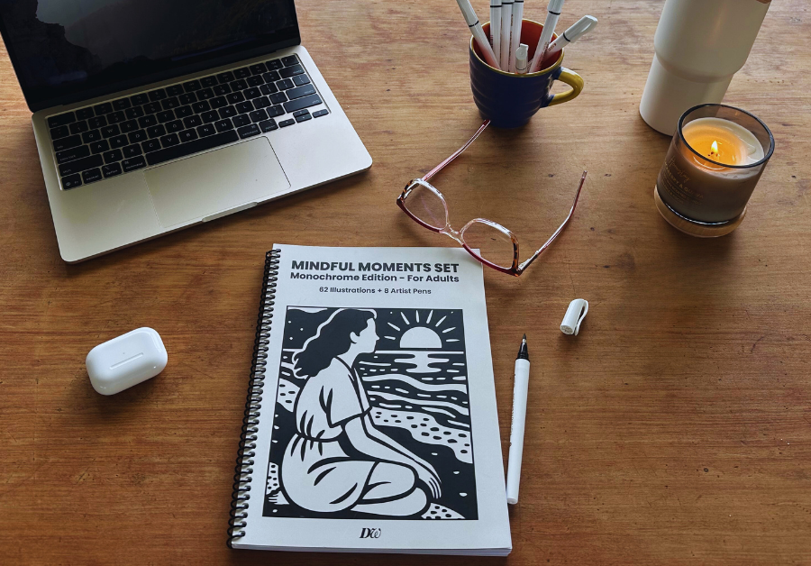 62 exklusive monochrome Motive und 8 Premium-Stifte – langlebig, weich, perfekt für dein Ruhe-Ritual.