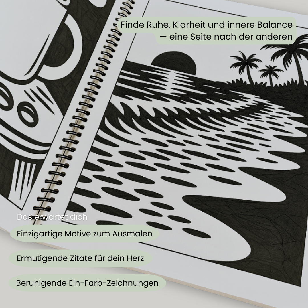 Es ist ein Set mit über 60 einzigartigen, monochromen Motiven zum Ausmalen. Jedes Bild beginnt als einfache Form und entfaltet sich Schritt für Schritt zu einem kleinen Kunstwerk. So wird jede Seite zu einem beruhigenden Ritual, das dir hilft, abzuschalten und den Alltag loszulassen.
