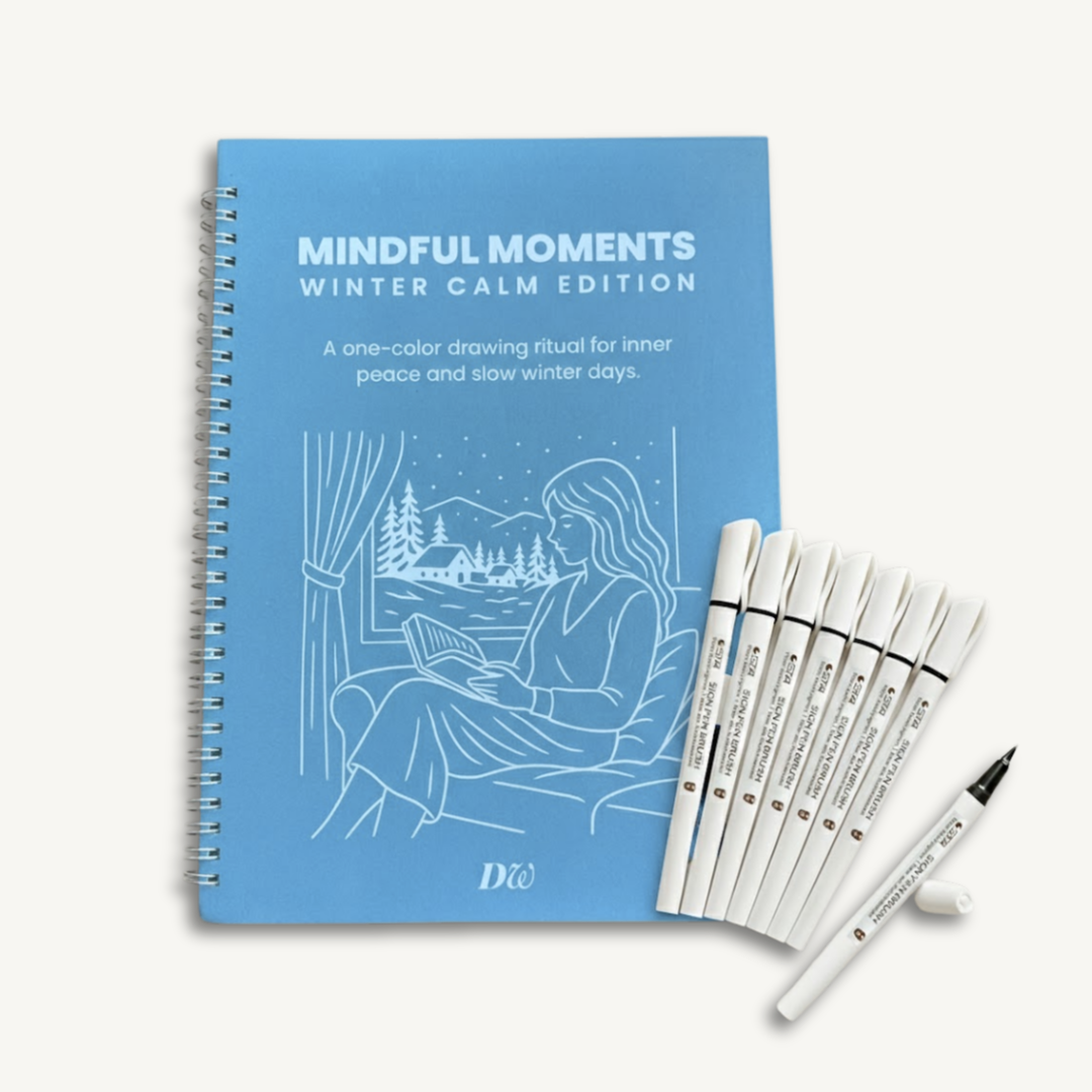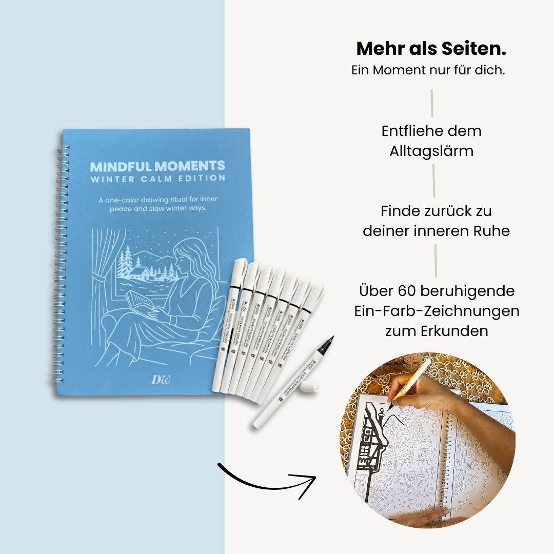 Die Mindful Moments – Winter Calm Edition ist ein bewusst einfaches Zeichenritual für langsame Wintertage und ruhige Abende. Sie hilft dir, Gedanken loszulassen und innerlich zur Ruhe zu kommen – ohne Bildschirm, Ablenkung oder Leistungsdruck.